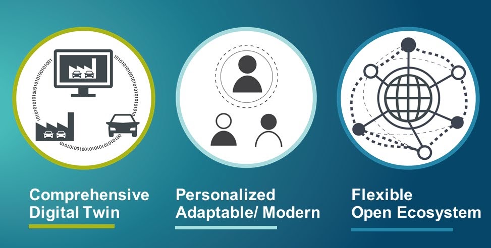 포괄적인 디지털 트윈은 물리적인 제품과 사양을 포함해 프로세스 흐름의 모든 시점을 가상공간에 정밀하게 표현할 수 있어야 합니다. 그리고, 전체 수명주기에 걸쳐 제품이나 생산 시스템을 시뮬레이션/예측/최적화해야 합니다. 제품이 복잡해질 수록 디지털 트윈도 CAD, CAE, 소프트웨어 바이너리, ECU, 와이어 하네스 모델, BOM 등이 포함되면서 함께 복잡해지고 진화합니다.