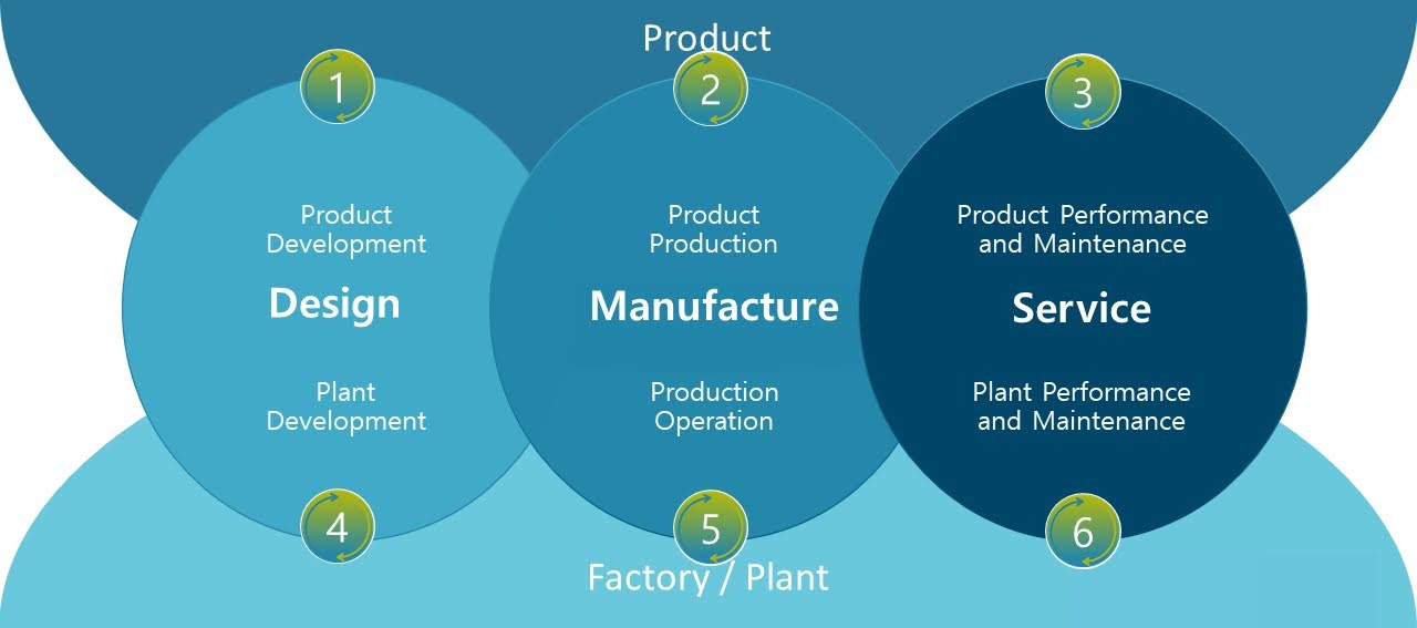 지멘스는 디지털 트윈의 수명주기를 설계, 제조, 서비스의 세 단계로 정리했는데, 제품과 마찬가지로 공장에 대해서도 공장의 설계, 생산 및 운영을 통한 건설과 커미셔닝, 공장 서비스 등 3단계의 디지털 트윈을 제시했습니다.