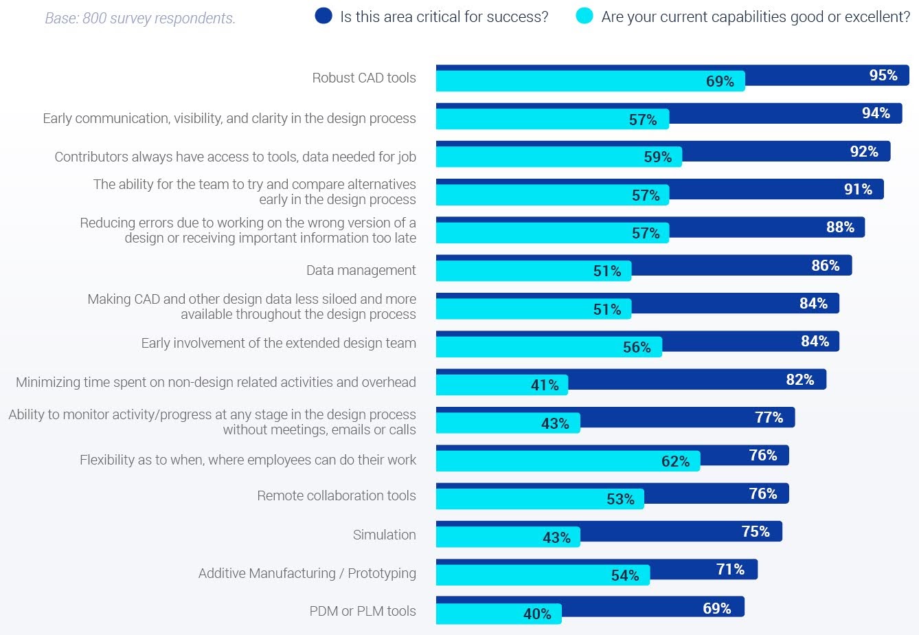 이번 조사에서 제품 개발 혁신을 위해 가장 중요한 역량으로 응답자들은 ‘강건한 CAD 툴'(95%), ‘설계 프로세스 초기 단계의 커뮤니케이션/가시성/명확성'(94%), ‘업무에 필요한 툴과 데이터에 대한 지속적인 접근'(92%), ‘설계 프로세스 초기에서 설계 대안을 시도하고 비교할 수 있는 역량'(91%) 등을 많이 꼽았다.