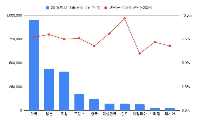 각 나라별로 2019년 시장 규모를 분석하면서, 심데이터는 우리나라 PLM 시장에 대해 작년 매출은 7억 4260만 달러이며, 2024년까지 연평균 8.1% 성장할 것으로 분석했다. 지난 7월 심데이터가 공개한 지역별 및 글로벌 평균 이상의 성장을 예상한 것이다.