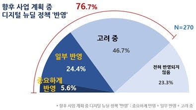 전반적으로 국내 기업은 정부의 디지털 뉴딜 정책에 대해 긍정적으로 인식하는 것으로 나타났다. 매출액 1000억 원 이상의 국내 민간 기업을 대상으로 한 이번 조사에서 응답자의 87.4%가 정부가 지난 7월 발표한 한국형 뉴딜 정책에 대해 인지하고 있으며, 77%는 디지털 뉴딜 정책에 관심을 갖고 있다고 대답했다. 또한, 국내 기업들 중 76.7%는 향후 사업계획에 디지털 뉴딜 정책을 반영하겠다고 응답했다.