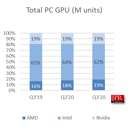 GPU는 공급 업체가 PC를 출하하기 전에 시스템에 탑재되기 때문에, GPU 출하량은 PC 시장의 선행 지표로 여겨진다. JPR은 2020년 3분기 Market Watch 보고서를 통해 GPU 시장의 추세를 분석하면서, “2020년 이전에는 PC 시장이 발전의 조짐을 보이고 새로운 표준이 정착되는 듯이 보였지만, 글로벌 팬데믹은 모든 모델과 예측에 영향을 주었다”고 전했다. 또한, “이번 보고서가 2020년 3분기의 추세를 확인할 수 있었던 한편으로 올 한 해동안 매우 이례적인 일들이 뒤섞인 결과를 보여준다”고 전했다.