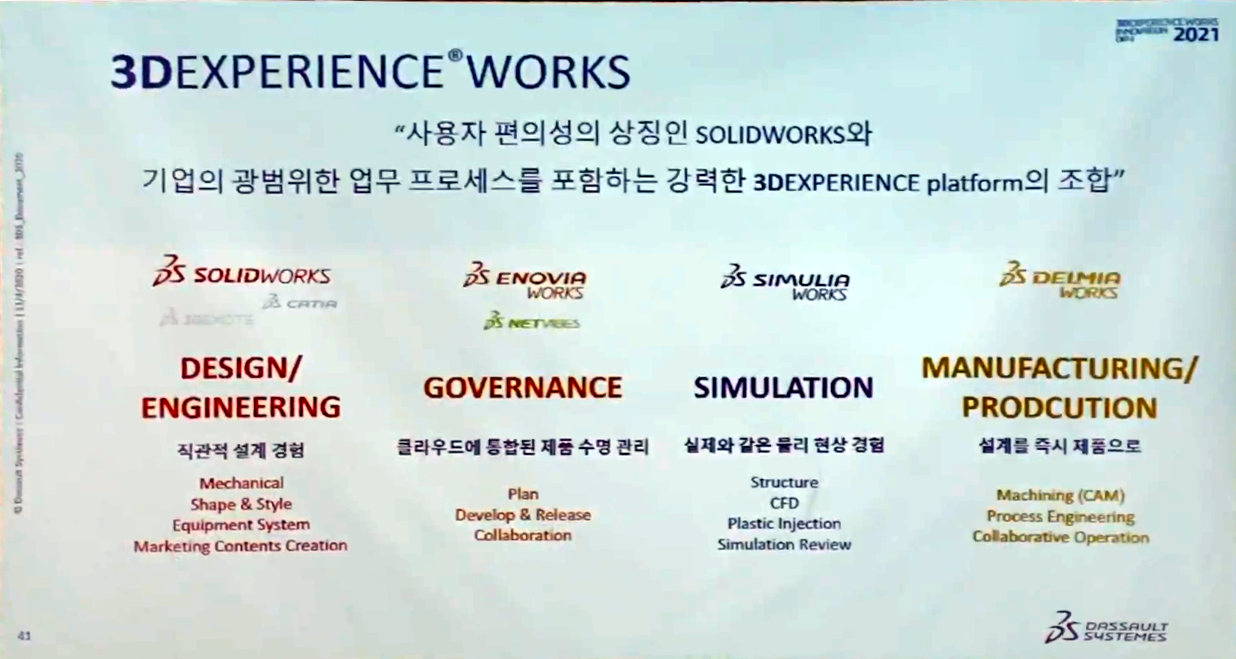 현재 공개된 3D익스피리언스웍스 포트폴리오는 ▲디자인 및 엔지니어링을 위한 솔리드웍스 ▲구조해석, 유동해석, 사출해석을 제공하는 시뮬리아웍스(SIMULIAworks) ▲클라우드 기반의 PLM(제품 수명주기 관리)과 PMS(프로젝트 관리)를 지원하는 에노비아웍스(ENOVIAworks) ▲BOM(Bill-of-Materials) 관리, 제조현장 협업, CAM 등을 위한 델미아웍스(DELMIAworks) 등 네 가지로 이뤄져 있습니다.