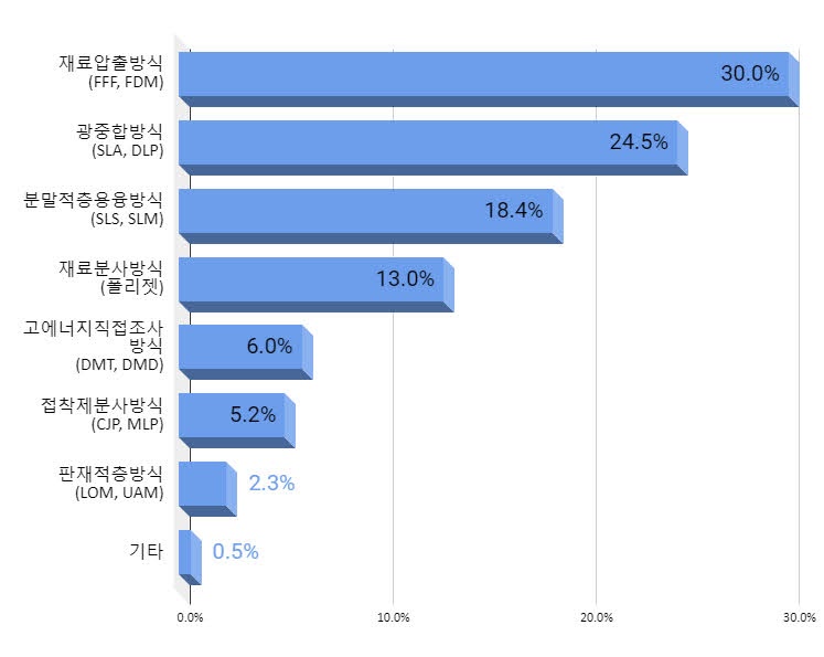 이어서 SLS, SLM 등 분말적층용융방식이 18.4%, 폴리젯 등 재료분사방식이 13.0%의 순서로 나타났습니다.