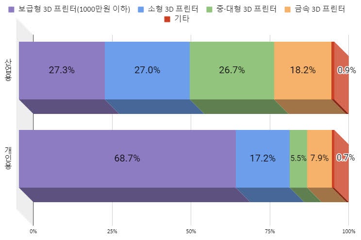 산업용 3D 프린터를 도입할 예정인 응답자들은 각 형태를 비슷한 비중으로 꼽았지만, 개인용에서는 보급형 3D 프린터의 응답 비중이 압도적으로 높았습니다.