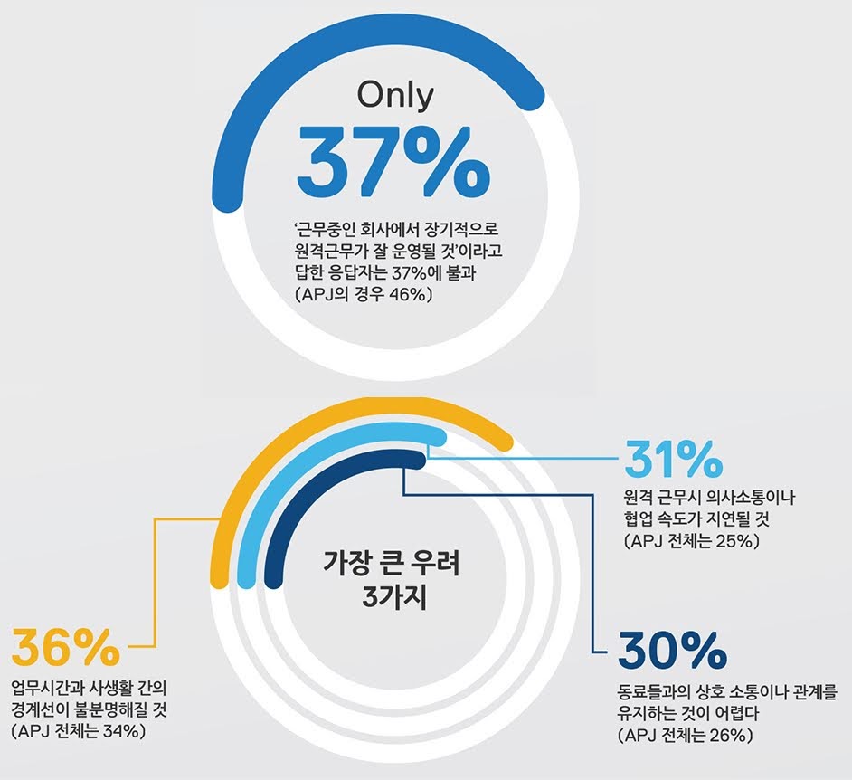 설문에 답한 한국 직장인의 77%가 ‘장기적인 원격 근무에 어느 정도 준비되어 있다’고 답했지만, ‘자신이 근무 중인 회사에서 장기적으로 원격 근무가 잘 운영될 것’이라고 답한 응답자는 37%에 그쳤다. 설문에 참여한 국내 직장인들은 ‘장기적인 원격 근무 시에 업무시간과 사생활간 경계선이 불분명해질 것(36%)’을 가장 걱정했다.