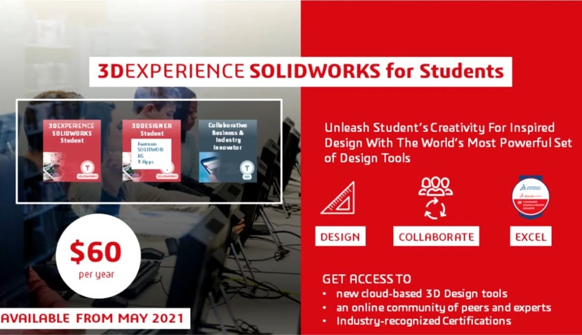교육용 3D익스피리언스 솔리드웍스는 교육용 3D익스피리언스 솔리드웍스, 교육용 3D 디자이너, 협업 비즈니스 및 인더스트리 이노베이터 애플리케이션이 제공된다. 사용자는 3D익스피리언스 플랫폼의 글로벌 온라인 커뮤니티에 참여할 수 있으며, 두 가지 업계 인증 등의 혜택이 제공된다. 가격은 연 60달러이며, 5월에 출시될 예정이다.