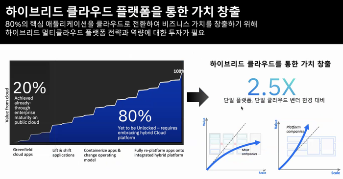 한국IBM의 CTO인 이지은 전무는 전세계 6000여 명의 경영진을 대상으로 IBM 기업 가치 연구소가 조사한 보고서를 인용해 “하이브리드 멀티 클라우드 플랫폼을 이용하는 기업은 단일 클라우드 환경보다 2.5배의 가치를 실현할 수 있는 것으로 나타났다”고 설명했다.