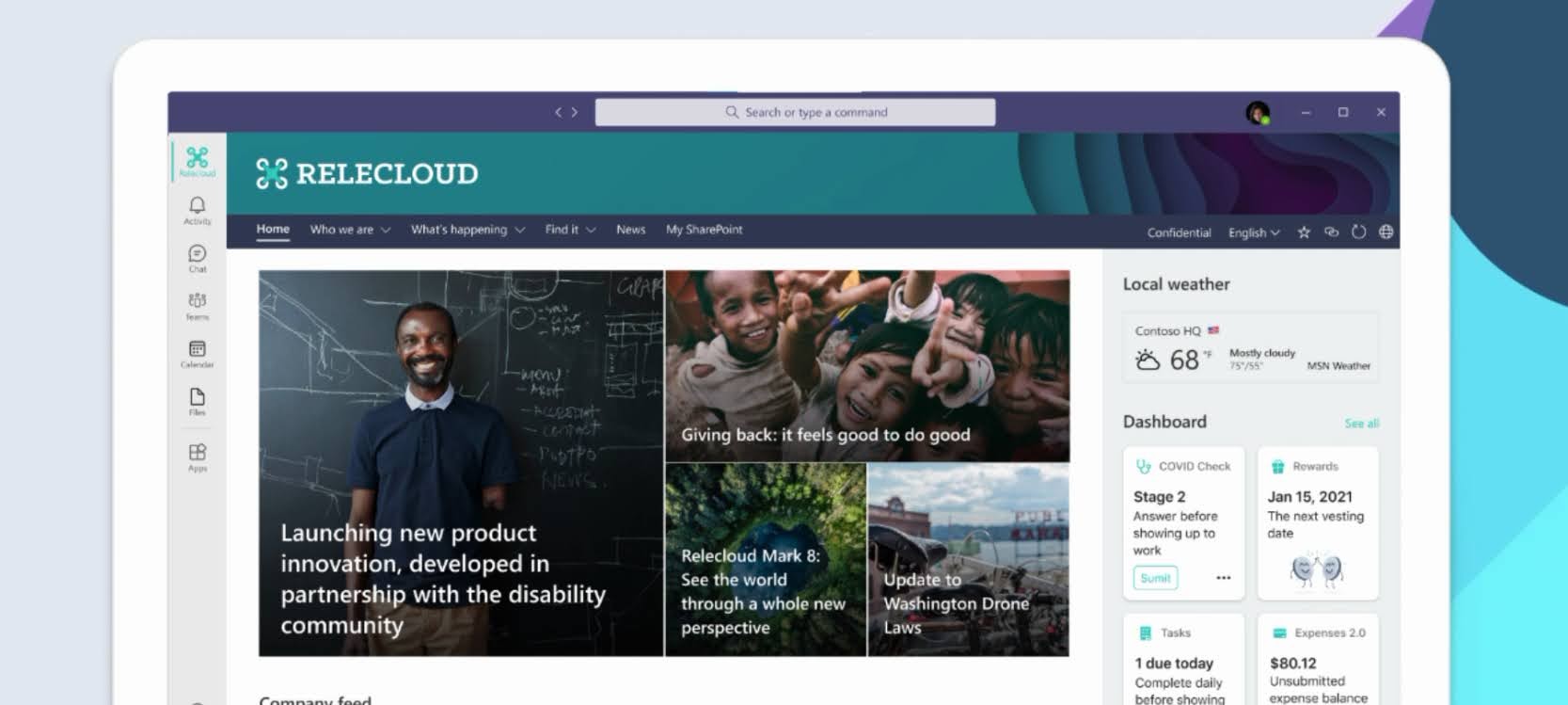 팀즈(Teams)는 화상회의, 채팅, 전화, 문서 공동작업, 프로세스 자동화까지 업무에 필요한 전 영역을 지원하는 협업 플랫폼이다. 팀즈는 디지털 워크스페이스와 전용 인증장비들을 결합한 최첨단 공간 디자인 팀즈룸(Teams Rooms)을 제공하는데, 여기에는 인공지능 기반의 고품질 오디오 및 비디오가 포함되어 공평하고 포용적인 업무 경험을 제공한다.