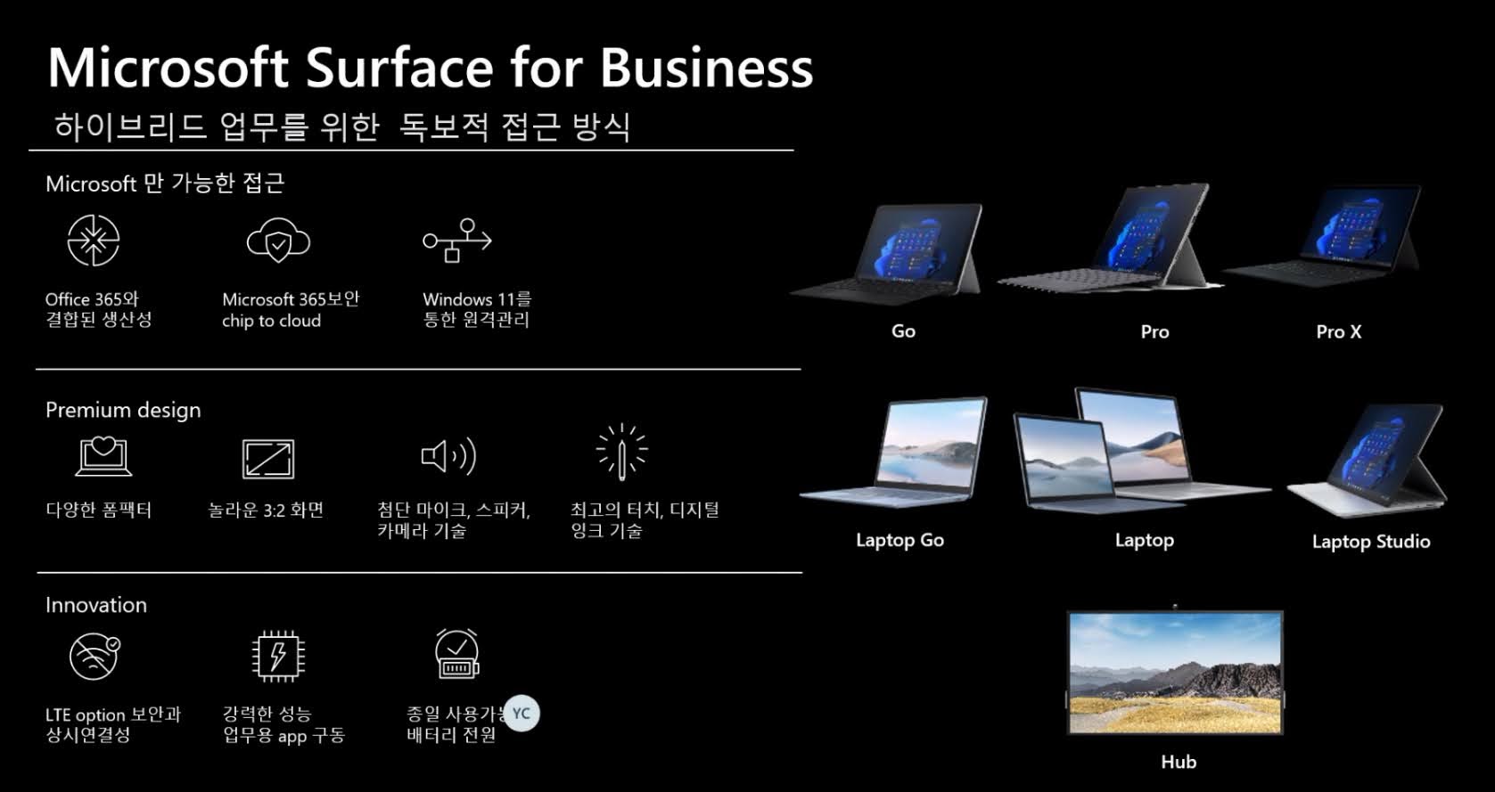 서피스 허브, 서피스 랩탑, 서피스 프로 등 7개 제품군으로 구성된 서피스 포트폴리오는 다양한 사용 목적에 맞춘 디자인뿐 아니라 운영 편의성, 사용 편리성, 창의력과 협업을 지원하고 미래 지향적인 업무방식에 최적화돼 기존의 업무 환경을 그대로 활용할 수 있도록 한다. 보안도 강화됐다.