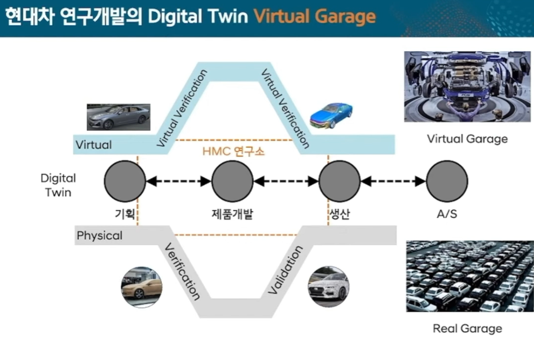 이런 디지털 트윈을 연구개발 영역에 적용하기 위해 현대자동차가 만든 시스템이 ‘버추얼 개러지’인데요. 시뮬레이션 모델이나 가상 차량 모델을 버추얼 개러지 한 곳에 저장하고, 연구원은 여기에서 연구에 필요한 최적의 가상 모델을 선택해 사용할 수 있다고 합니다.