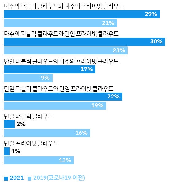 이번 설문조사에서는 단일 프라이빗 혹은 퍼블릭 클라우드를 사용하는 기업의 비율이 2019년 29%에서 2021년 3%로 감소했다. 국내의 경우에도 ‘다수의 퍼블릭 클라우드 및 프라이빗 클라우드’를 사용한 기업 비율이 2019년 18%에서 2021년 30%로 증가한 것으로 나타났다.