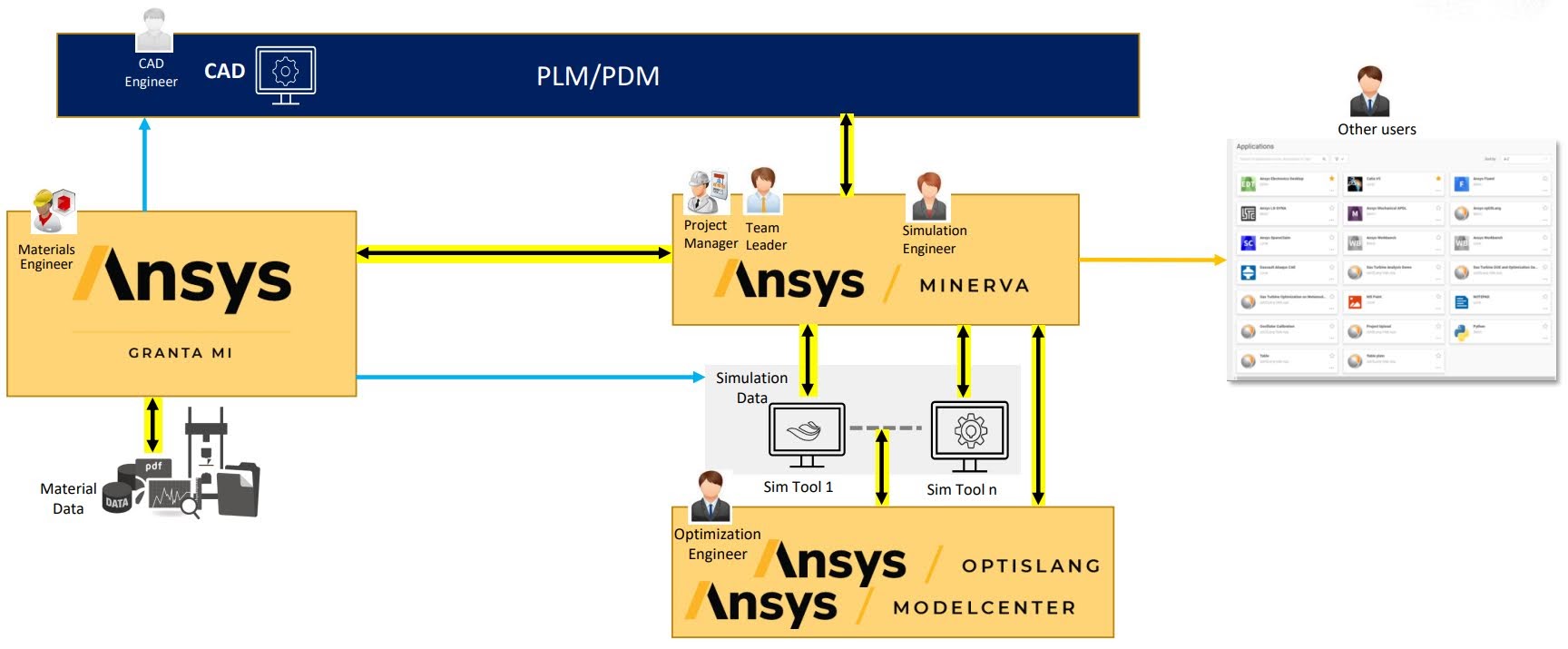 앤시스는 시뮬레이션 자산을 관리하고 전체 디지털 스레드와 연결하는 데에 중점을 둔 시뮬레이션 플랫폼으로서 SPDM(시뮬레이션 프로세스 및 데이터 관리)와 MIM(재료 정보 관리) 시스템을 내세우고 있습니다. 이 시스템은 재료 데이터와 시뮬레이션 프로세스 등 지적자산(IP)을 제어하고, 중요한 해석 프로세스를 캡처해 자동화·최적화하거나 벤치마크하는 기능을 제공합니다. 그리고 PLM 및 ERP(전사 자원계획 관리) 시스템과 연결할 수 있는 구조를 갖습니다. 앤시스는 시뮬레이션 플랫폼이 비전문가의 시뮬레이션 접근성을 높일 수 있도록 돕는 역할을 하게 될 것으로 보고 있습니다.