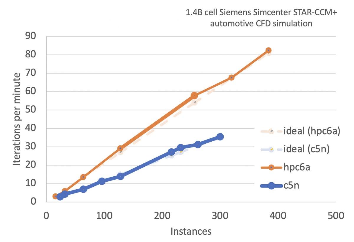 AWS의 설명에 따르면 HPC6a 인스턴스는 384GB RAM과 96개의 3세대 에픽 프로세서 코어로 100Gbps 네트워킹을 제공하며, 동급의 x86 기반 컴퓨팅 최적화 인스턴스보다 향상된 가격 대비 성능을 제공한다. AWS는 심센터 STAR-CCM+(Simcenter STAR-CCM+)의 자동차 CFD 시뮬레이션 벤치마크 결과를 소개했는데, 이 벤치마크에서는 Hpc6a가 EFA 네트워킹을 통해 최대 400개의 노드(약 40,000코어)까지 확장할 때 약 100%의 확장 효율성을 유지하면서, c5n 인스턴스에 비해 비용이 70% 저렴한 것으로 나타났다. AWS는 “Hpc6a 인스턴스를 사용할 때 더 저렴한 비용으로 새로운 설계를 더 빠르게 제공할 수 있다”고 덧붙였다.