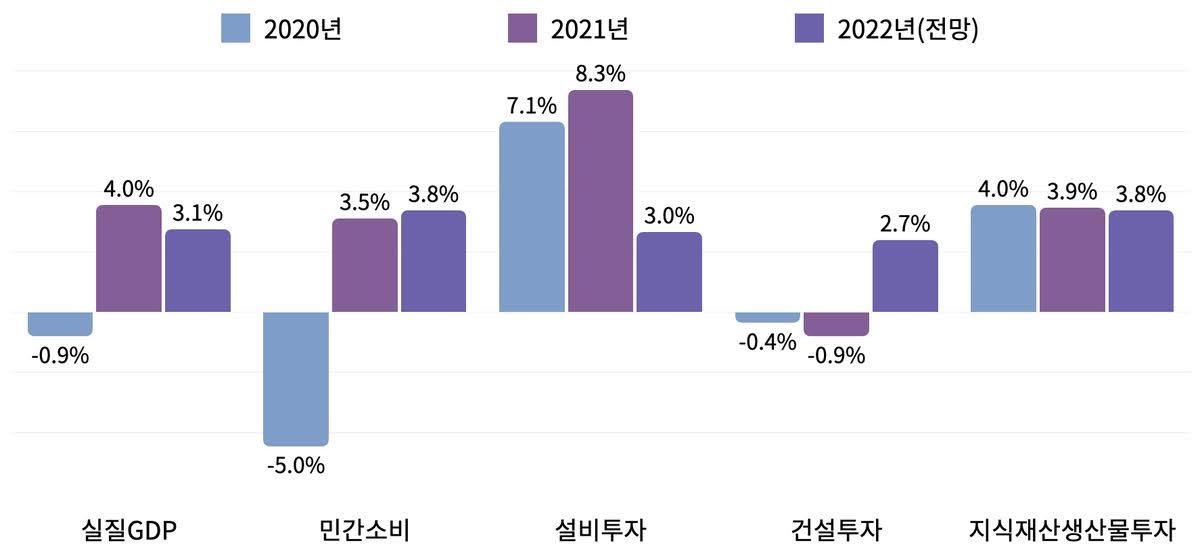 기획재정부는 2021년 우리나라 실질 GDP가 전년도 대비 4.0% 성장한 것으로 분석했습니다. 글로벌 경기 및 반도체 업황 개선 등에 따라 수출 투자가 탄탄한 흐름을 보이고, 민간소비도 백신 접종 확대 등으로 점차 회복되었다는 것입니다. 연내 몇 차례 큰 폭의 코로나19 확산이 나타나고 글로벌 공급망이 차질을 빚는 등의 조정기가 있었지만, 정부는 특히 4분기에는 내수를 중심으로 경기가 반등한 것으로 봤습니다.