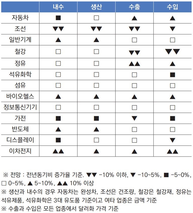 산업연구원은 2022년 13대 주력산업의 수출액이 약 5115억 달러 규모로, 코로나19 팬데믹 이전 수준을 웃돌 것으로 전망했습니다. 한편 기저효과 및 동남아의 코로나19 변이 바이러스 확산, 반도체 수급 불균형, 중국 경기 둔화 등의 제약 요인으로 증가폭은 작년이 비해 둔화될 전망입니다.