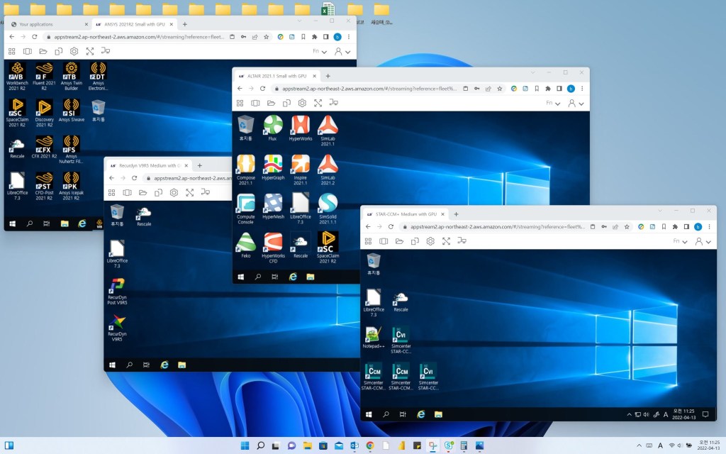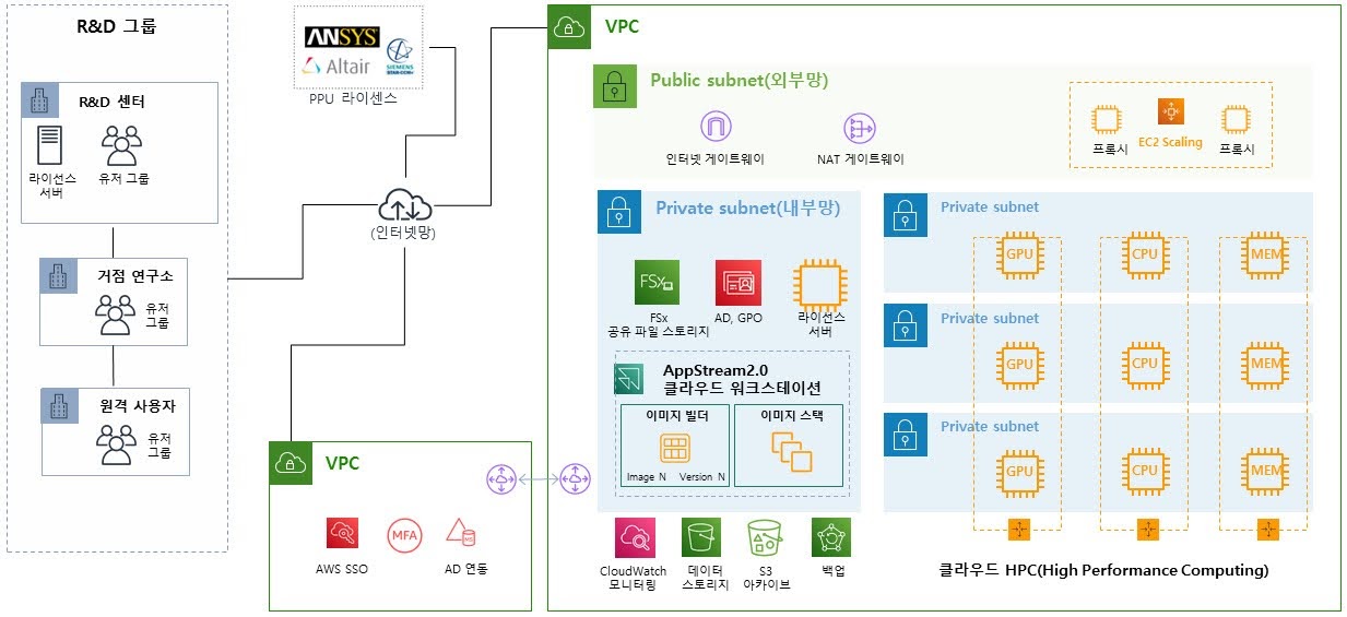 이를 해결하기 위해 LS일렉트릭은 AWS 클라우드 서비스를 이용한 SDM(시뮬레이션 데이터 관리) 체계를 구축했습니다. SDM 구축을 위해 LS일렉트릭은 해석 업무 관련 프로세스의 일부를 AWS 클라우드 서비스의 앱스트림 2.0(Amazon AppStream 2.0) 기반으로 전환해 가상접속 환경(VDI : Virtual Desktop Interface)을 구성했습니다. 앱스트림 2.0은 클라우드에 애플리케이션을 구축하고, 인터넷을 통해 스트리밍 방식으로 배포할 수 있는 서비스인데요. 스트리밍 방식의 가상접속 환경을 제공하는 앱스트림 2.0을 활용하면 CAE 소프트웨어를 빠르게 사용하고, 해석 수행을 위한 전/후처리 작업을 편리하게 처리할 수 있다고 합니다.