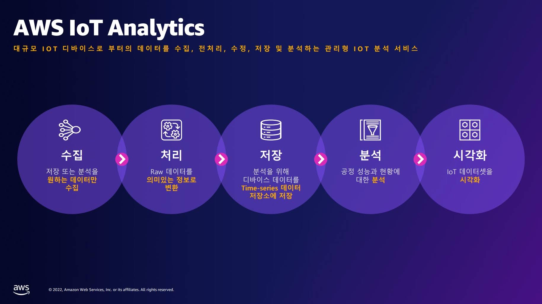 AWS는 지속 성장이 가능한 비즈니스를 구축하기 위해 비즈니스의 주변 환경을 이해하는 것부터 시작해, 활용 가능한 데이터를 어떻게 의사결정에 활용할 것인지까지 전체적 관점에서 측정해야 한다고 보고 있습니다. 그리고 데이터에 기반한 비즈니스 의사결정을 강조하면서, 자사의 다양한 클라우드 서비스를 소개했습니다.