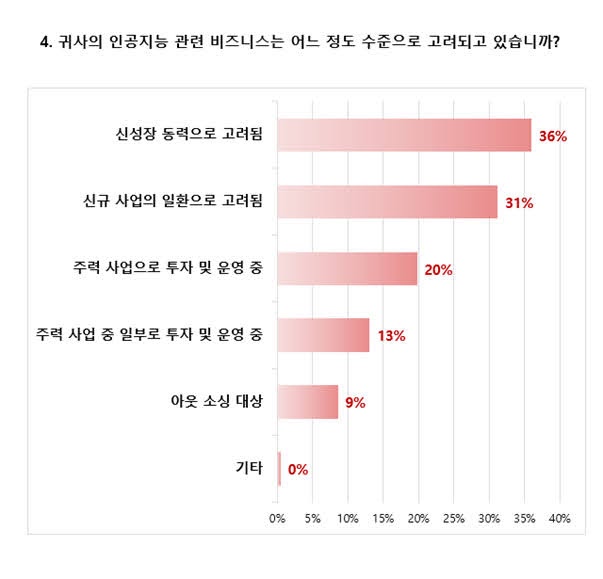 AI 활용 단계로는 기획 단계가 72%로 가장 많았고, 신성장 동력으로 고려한다는 응답이 36%, 신규 사업의 일환으로 고려하고 있다는 답변이 31%를 차지했다. 테스트웍스는 인공지능의 활용 단계와 함께 인공지능 활용 사업이 지속적으로 증가할 것으로 보았다.