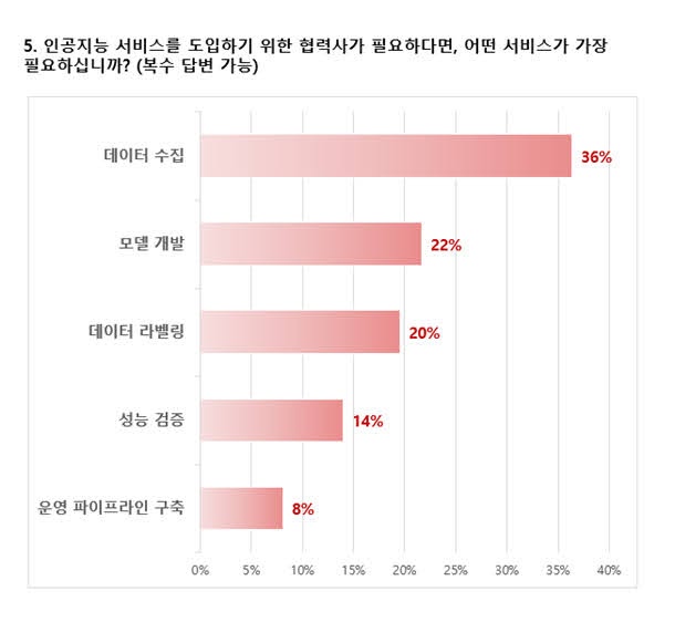 AI 비즈니스를 위한 협업 파트너로 선호하는 기업에 대한 설문에서는 일부 서비스를 전문적으로 제공하는 기업이 34%, 전체 서비스를 제공하는 기업이 47%를 차지해 ‘원스톱 솔루션(one-stop solution)’에 대한 요구사항이 높은 것으로 나타났다.
