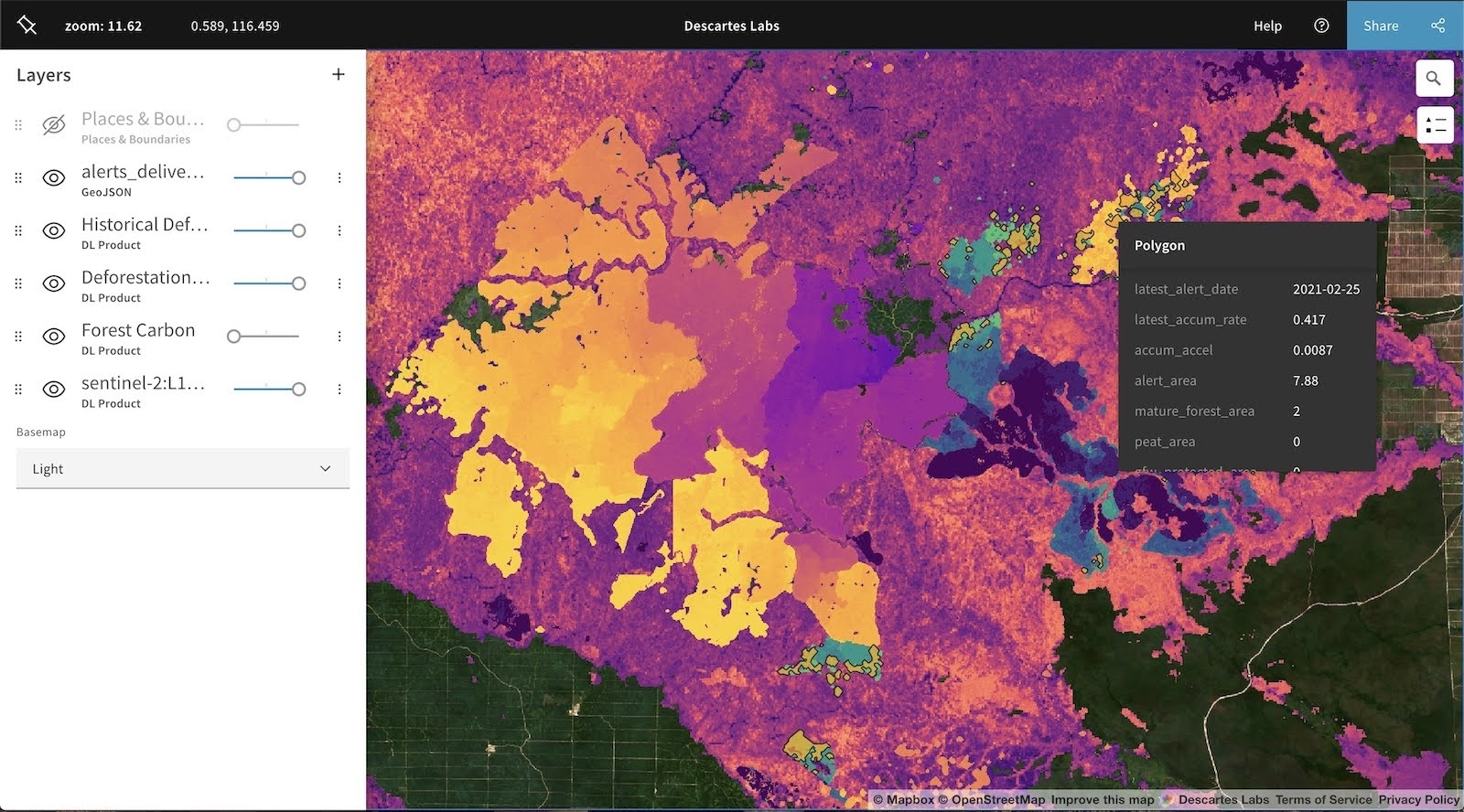 AWS에서 실행되는 데카르트 랩스의 탄소 분석 API 서비스는 포장 소비재(CPG), 임업, 광산업 고객을 위해 탄소 측정, 보고, 검증을 제공한다. 이 서비스는 CPG 회사가 온실가스 배출을 추적하는 데 중요한 공급망의 탄소 발자국을 평가하는 데 도움을 준다. 임업 회사에는 산림 관리 기술의 탄소 모니터링을 위한 보고 시스템을 제공한다. 광산업체는 이 서비스를 사용하여 현장 조사에서 폐쇄까지 전체 채굴 수명 주기 동안 탄소 및 생물 다양성 손실과 이득을 모니터링한다. 또한 데카르트 랩스는 AWS 리소스를 통해 사용 가능한 데이터 세트(Registry of Open Data on AWS)를 사용하여 기업, 정부 기관, 학계에 여러 대규모 데이터 세트를 호스팅, 저장, 제공하여 온실가스 배출량을 분석하고 지속 가능한 솔루션에 대해 협업하고 있다.