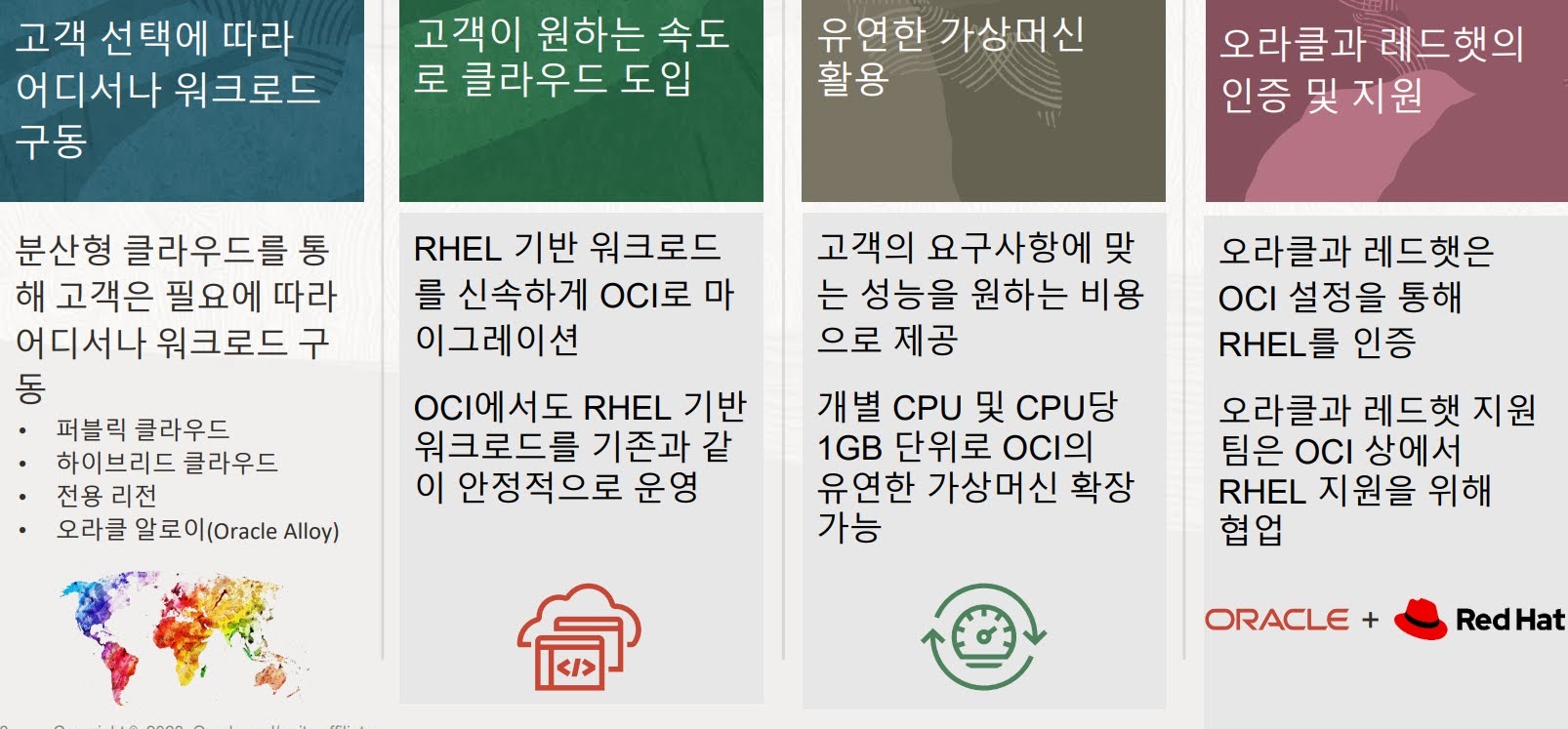OCI는 고객이 복수의 클라우드에 걸쳐 데이터 레지던시, 지역성 및 권한 제어를 강화할 수 있는 ‘분산형 클라우드’를 제공한다. 퍼블릭 클라우드뿐 아니라 온프레미스를 포함하는 하이브리드 클라우드, 멀티 클라우드, 기업의 데이터센터 안에서 오라클 클라우드 서비스를 구동하는 OCI 전용 리전 등 다양한 클라우드 환경을 제공한다. 오라클은 다양한 분산형 클라우드 환경에서 래드햇 엔터프라이즈 리눅스를 설치하고 사용하는데 있어 동일한 경험을 제공한다는 계획이다.