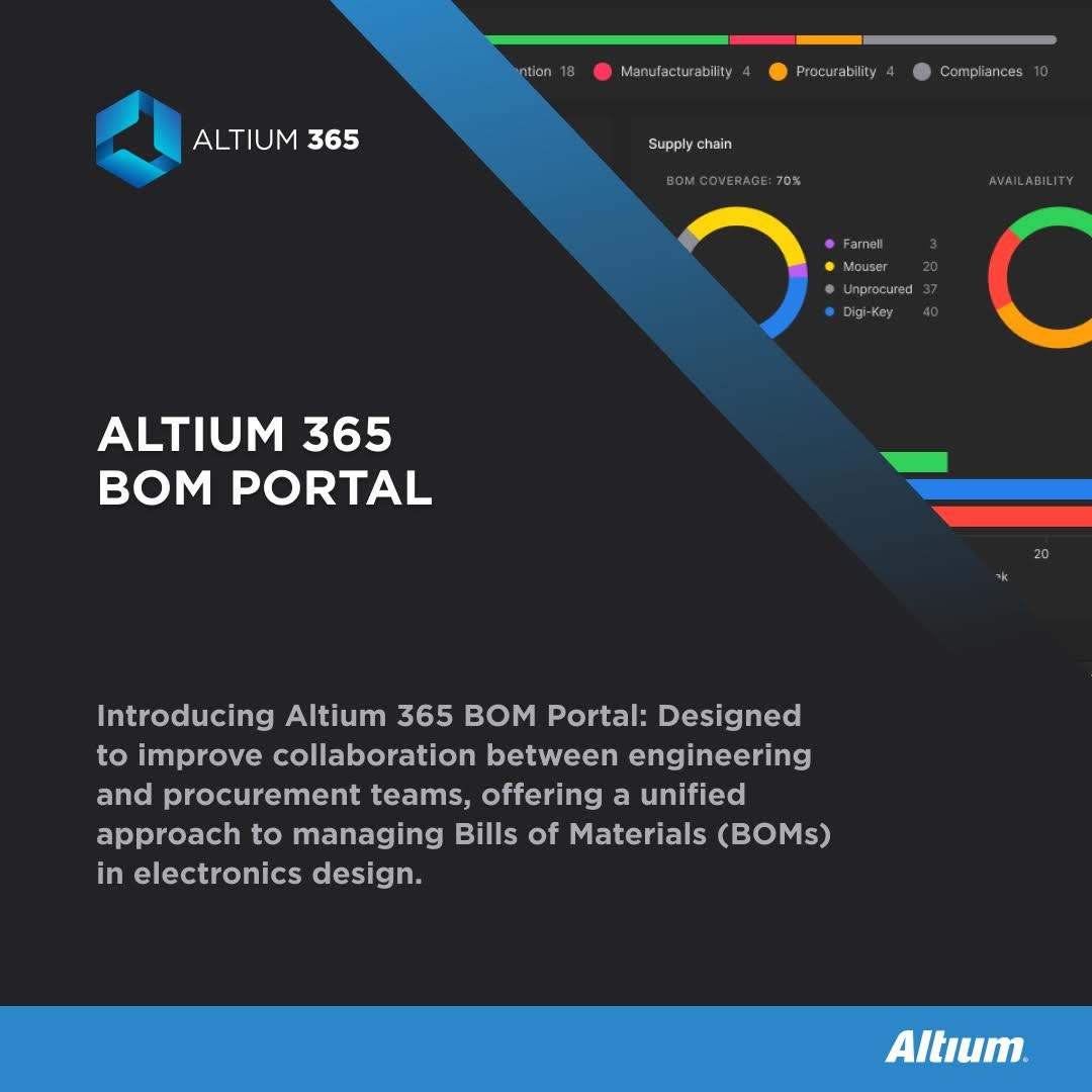 알티움 365 BOM 포털은 하드웨어 개발과 통합된 BOM 관리를 제공한다. 엔지니어링 팀과 조달 팀 간의 장벽을 허물어 직접적인 커뮤니케이션을 촉진하고, 잘못된 의사소통이나 실수 또는 지연의 위험을 줄인다. BOM 포털은 옥토파트, S&P 글로벌(구 IHS 마킷), 실리콘엑스퍼트, 그리고 곧 출시될 Z2Data의 실시간 상세 부품 정보에 대한 액세스를 제공하여 조달 및 설계 프로세스를 개선한다.