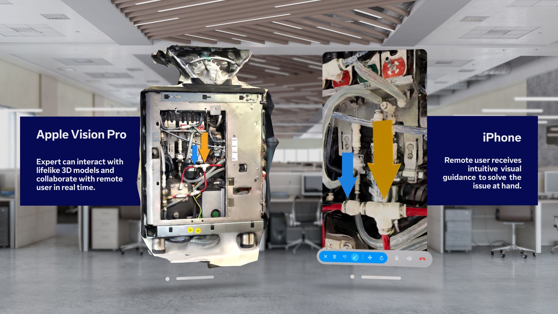 애플 아이폰 12 프로 이상 기종 및 iOS 17이 설치된 애플 기기에서 사용 가능한 ‘팀뷰어 스페이셜 서포트’는 에이알킷(AR-Kit)과 탑재된 라이다(LiDAR) 스캐너를 이용해 지원이 필요한 기기의 3D 모델을 정밀하게 캡처한다. 공유 세션을 이용해 원격지에 있는 전문가는 애플 비전 프로에서 ‘팀뷰어 스페이셜 서포트’ 앱을 사용해 아이폰으로 캡처된 시각 모델과 상호 인터랙션이 가능하며, 동기화된 3D 모델을 토대로 전문가는 주석 및 3D 시각 기술을 이용해 현장 기술자에게 가이드를 제공할 수 있다.