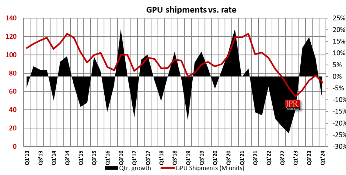 코로나19 펜데믹을 거치면서 GPU 시장은 수요 급증과 공급망 문제 등의 영향으로 급격한 변동을 보였다. 이런 변동은 시장의 불안정성을 반영한다는 견해도 있는데, 2024년 1분기의 경우 팬데믹 이전과 비슷하게 감소 추세를 보였다. JPR은 “일반적으로 매년 첫 번째 분기는 이전 분기와 비교하여 평탄하거나 하락세를 보인다”면서도, “이번 분기 독립형 GPU의 증감률은 지난 10년간의 평균치보다 낮은 수치”라고 설명했다. 한편, 모든 플랫폼과 유형을 포함한 연간 총 GPU 출하량은 28% 증가했고 데스크톱 그래픽은 7% 감소, 노트북은 38% 증가했다.