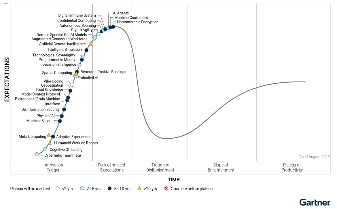가트너가 ‘2025 신기술 하이프 사이클(2025 Hype Cycle for Emerging Technologies)’을 통해 주목해야 할 주요 혁신 기술로 ▲기계 고객 ▲AI 에이전트 ▲의사결정 인텔리전스 ▲프로그래머블 머니를 선정했다.